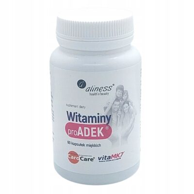 Aliness ProADEK® Complex to suplement diety, który dostarcza naturalnych witamin A, D, E i K w opatentowanych formach, zapewniając wszechstronne wsparcie zdrowia kości, odporności, skóry i wzroku. Dzięki wysokiej jakości składnikom i czystemu składowi jest idealnym wyborem dla osób dbających o swoje zdrowie.