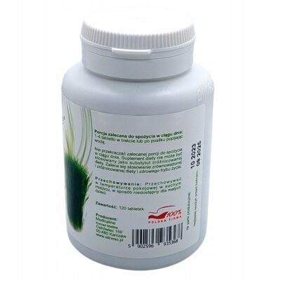 - Sproszkowany sok z pędów młodego jęczmienia (Hordeum vulgare L.) – 450 mg w 1 tabletce / 1800 mg w 4 tabletkach