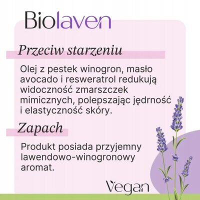 Zadbaj o delikatną skórę wokół oczu z BIOLAVEN Kremem pod oczy, który zapewnia codzienną pielęgnację dla skóry suchej, wrażliwej oraz z oznakami starzenia. Lekka formuła z naturalnymi składnikami aktywnymi, takimi jak resweratrol, olej z pestek winogron i masło avocado, działa przeciwzmarszczkowo, nawilża oraz wspiera regenerację, sprawiając, że skóra odzyskuje jędrność, elastyczność i zdrowy blask.