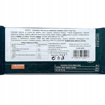 Czekolada mleczna ze stewią Trapa bez cukru 75 g Bezglutenowa