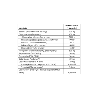• Alfa-amylaza: 3600 U – rozkłada węglowodany.