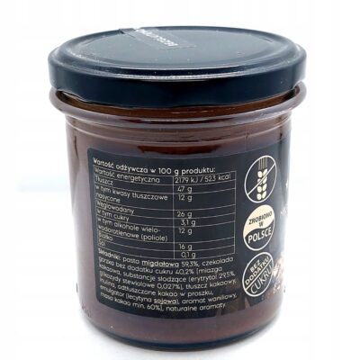 Bez dodatku cukru, bez mleka i bez oleju palmowego, nasz krem jest doskonałym wyborem dla osób na diecie bezcukrowej i niskowęglowodanowej. Jego kremowa konsystencja i wyrazisty smak prażonych migdałów sprawią, że każde śniadanie stanie się wyjątkowe. Naturalnie słodki, dzięki zawartości erytrytolu i glikozydów stewiolowych, zapewnia przyjemność bez wyrzutów sumienia.
