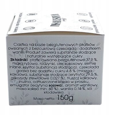 Składniki: płatki owsiane bezglutenowe, mąka owsiana bezglutenowa, mąka ryżowa, rodzynki, olej kokosowy, siemię lniane, erytrytol (substancja słodząca), czekolada gorzka bez dodatku cukru (miazga kakaowa, substancje słodzące [erytrytol 29,5%, glikozydy stewiolowe 0,027%], masa kakaowa, inulina, odtłuszczone kakao w proszku, emulgator [lecytyna sojowa], aromat waniliowy, masa kakao min. 60%), wanilia, sól himalajska.