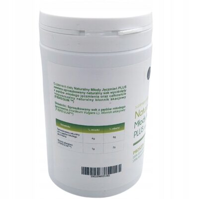 Suplement diety Naturalny Młody Jęczmień Plus zawiera sproszkowany naturalny sok wyciśnięty z pędów młodego jęczmienia oraz całkowicie rozpuszczalny naturalny błonnik akacjowy (FIBREGUM TM).