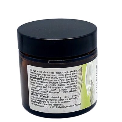 Składniki (INCI): Butyrospermum Parkii Butter, Sodium Bicarbonate, Solanum Tuberosum Starch, Cocos Nucifera Oil, Zeolite, Kaolin, Tocopherol, Litsea Cubeba Fruit Oil, Melaleuca Leucadendron Cajuputi Leaf Oil, Citral*, Citronellol*, Geraniol*, Linalool*, Limonene*