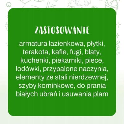 Zastosowanie: armatura łazienkowa, płytki, terakota, kafle, fugi, blaty, kuchenki, piekarniki, piece, lodówki, przypalone naczynia, elementy ze stali nierdzewnej, szyby kominkowe; do prania białych ubrań i usuwania plam.