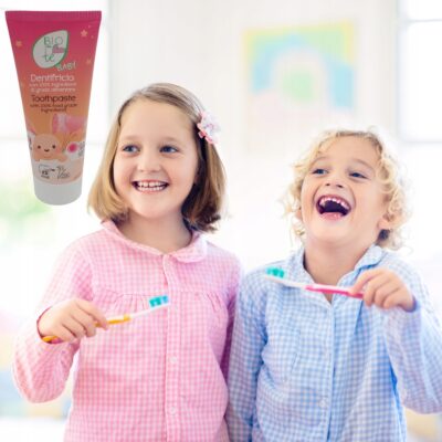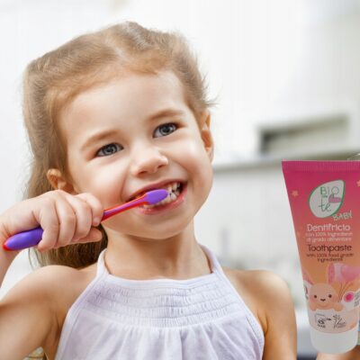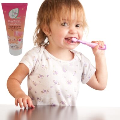 Pasta Biocontè Baby to naturalna, bezpieczna formuła do higieny jamy ustnej dla dzieci od pierwszego ząbka. Dzięki jadalnym składnikom nie stanowi zagrożenia w razie połknięcia.