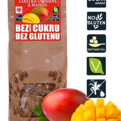 Te chrupiące, złociste ciastka to połączenie zdrowia i smaku. Wykonane na bazie bezglutenowych płatków owsianych, wzbogacone o suszone mango, są idealnym wyborem dla osób dbających o zbilansowaną dietę. Nie zawierają cukru – słodzone naturalnym erytrytolem, co sprawia, że są doskonałą opcją dla diabetyków oraz osób redukujących spożycie cukru.