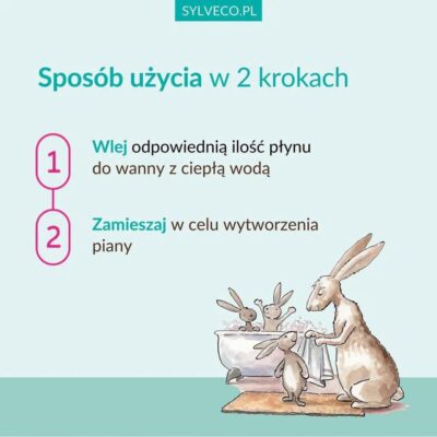 Odpowiednią ilość płynu wlać do wanny z ciepłą wodą i zamieszać w celu wytworzenia piany.