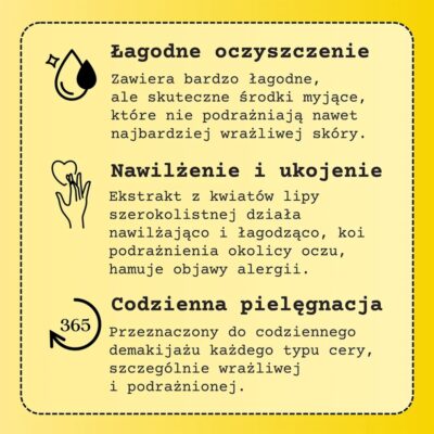 W tradycyjnym zielarstwie ekstrakt z kwiatów lipy szerokolistnej znany jest z właściwości łagodzących, nawilżających i kojących. W połączeniu z pantenolem, aloesem i naturalnym środkiem myjącym (Decyl Glucoside), płyn nie tylko oczyszcza, ale także wspiera regenerację naskórka, przywraca komfort i naturalną równowagę hydrolipidową skóry.