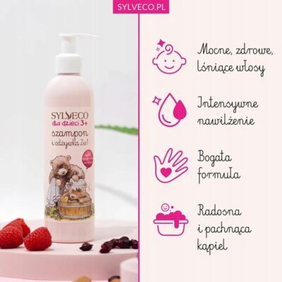 SYLVECO Szampon i odżywka 2w1 to delikatny produkt myjący i pielęgnacyjny, który dba o wrażliwą skórę głowy dziecka. Dzięki naturalnym składnikom nawilża i regeneruje włosy, ułatwiając ich rozczesywanie, a malinowy zapach sprawia, że codzienna kąpiel staje się jeszcze przyjemniejsza!