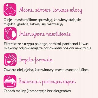 Delikatny malinowy zapach zachęca dziecko do codziennej pielęgnacji, nie zawiera syntetycznych alergenów.