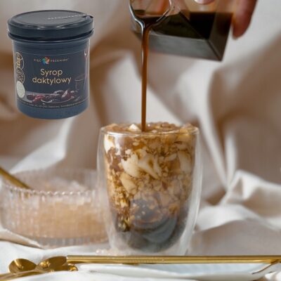 Syrop daktylowy to naturalny słodzik pozyskiwany z najwyższej jakości daktyli z Iranu. Ma ciemnobrązowy kolor, gęstą konsystencję i wyjątkowo bogaty, karmelowo-owocowy smak. Jest doskonałą alternatywą dla cukru, miodu oraz syropu klonowego.