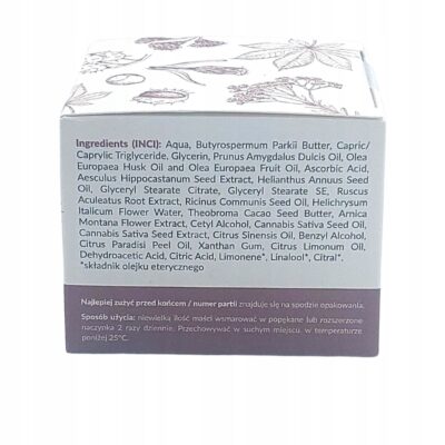 Aqua, Butyrospermum Parkii Butter, Capric/Caprylic Triglyceride, Glycerin, Prunus Amygdalus Dulcis Oil, Olea Europaea Husk Oil and Olea Europaea Fruit Oil, Ascorbic Acid, Aesculus Hippocastanum Seed Extract, Helianthus Annuus Seed Oil, Glyceryl Stearate Citrate, Glyceryl Stearate SE, Ruscus Aculeatus Root Extract, Ricinus Communis Seed Oil, Helichrysum Italicum Flower Water, Theobroma Cacao Seed Butter, Arnica Montana Flower Extract, Cetyl Alcohol, Cannabis Sativa Seed Oil, Citrus Sinensis Oil, Benzyl Alcohol, Citrus Paradisi Peel Oil, Xanthan Gum, Citrus Limonum Oil, Dehydroacetic Acid, Citric Acid, Limonene*, Linalool*, Citral*.