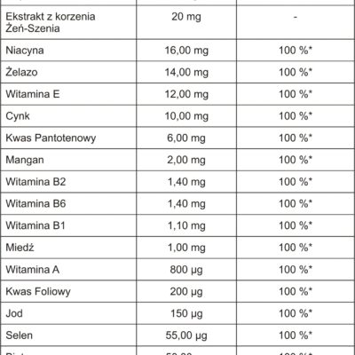 Składniki: Witamina C (L-askorbinian Sodu), Wyciąg z owoców Aceroli (Malpighia Glabra), Ekstrakt z korzenia Żeń-szenia, Niacyna (amid kwasu nikotynowego, substancja wypełniająca: błonnik akacjowy, substancja przeciwzbrylająca: krzemionka koloidalna, Żelazo (mleczan żelaza II), Witamina E (octan DL-alfa-tokoferylu), Cynk (siarczan cynku), Kwas Pantotenowy (D-pantotenian wapnia), Mangan (siarczan manganu), Witamina B2 (ryboflawina), Witamina B6 (chlorowodorek pirydoksyny), Witamina B1 (monoazotan tiaminy), miedź (siarczan miedzi II), Witamina A (octan retinylu), Kwas Foliowy (kwas pteroilomonoglutaminowy), Jod (jodek potasu), Selen (Selenian VI sodu), Biotyna (D-biotyna), Witamina D (cholekalcyferol), Witamina B12  (cyjanokobalamina),